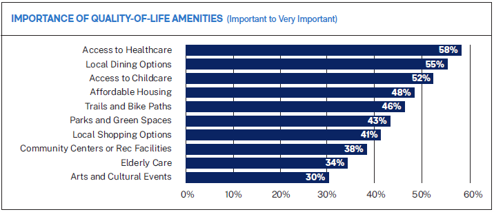 Only 29% of local leaders believe their community’s quality of life is a strong driver of business attraction. Yet the factors they identify as most important – healthcare access, childcare, affordable housing, and local dining – are the same elements that determine where people choose to live and work.