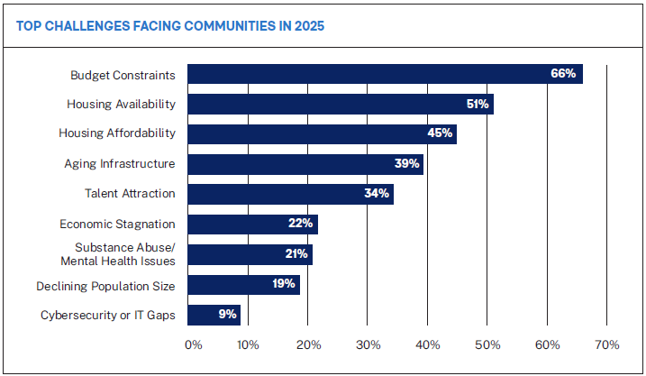 Budget pressure is the most common challenge, cited by two-thirds of survey respondents. Small towns, in particular, struggle with limited administrative capacity and fewer revenue tools, leaving them dependent on state or federal funds. Larger jurisdictions may have broader tax bases, but they face escalating costs for services, infrastructure, and workforce needs.